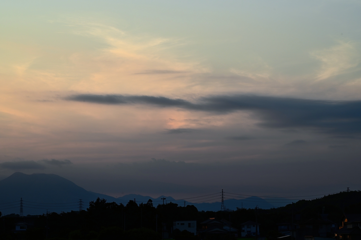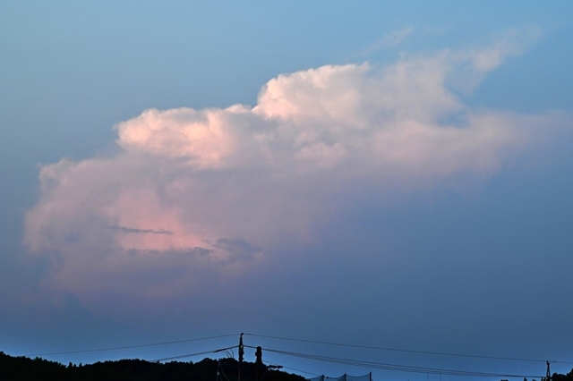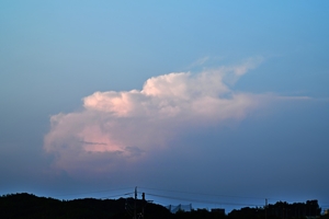 最高気温(桑名)は34.4℃と今日も猛暑日寸前。 ただ、南寄りの風がずいぶんと涼しく感じられました。 ここ数日、積乱雲はぐっと減少し、今日はゼロかと いうところでしたが、夕方に飛騨方面にひとつ出現。 ヘイズがかっていてかすかに存在がわかる程度 でしたが、日没前にようやく全貌が見えました。 (写真はかなりコントラストをあげてあります) |