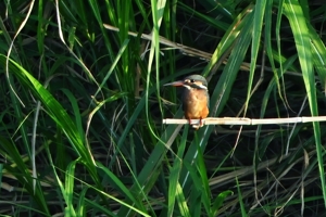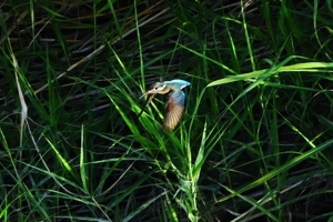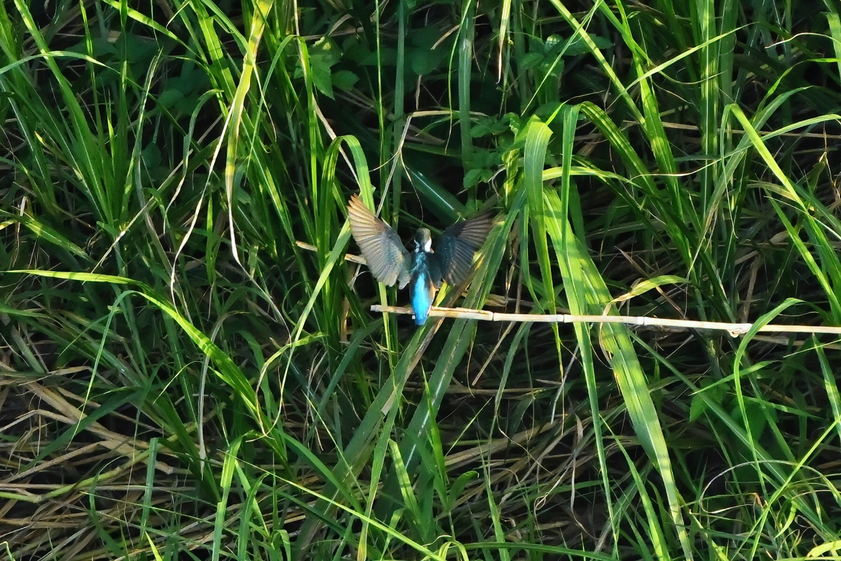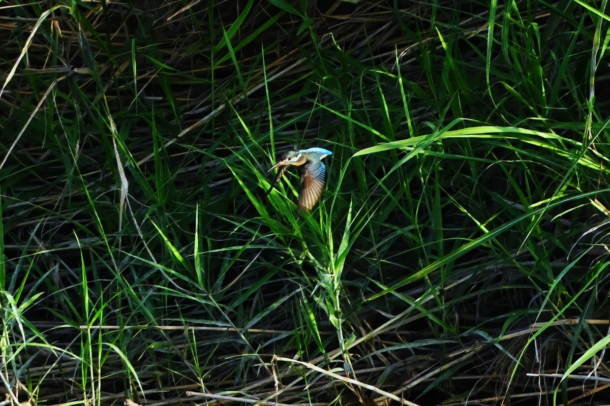 対岸(南岸)で繰り返し水面にダイブするカワセミ。