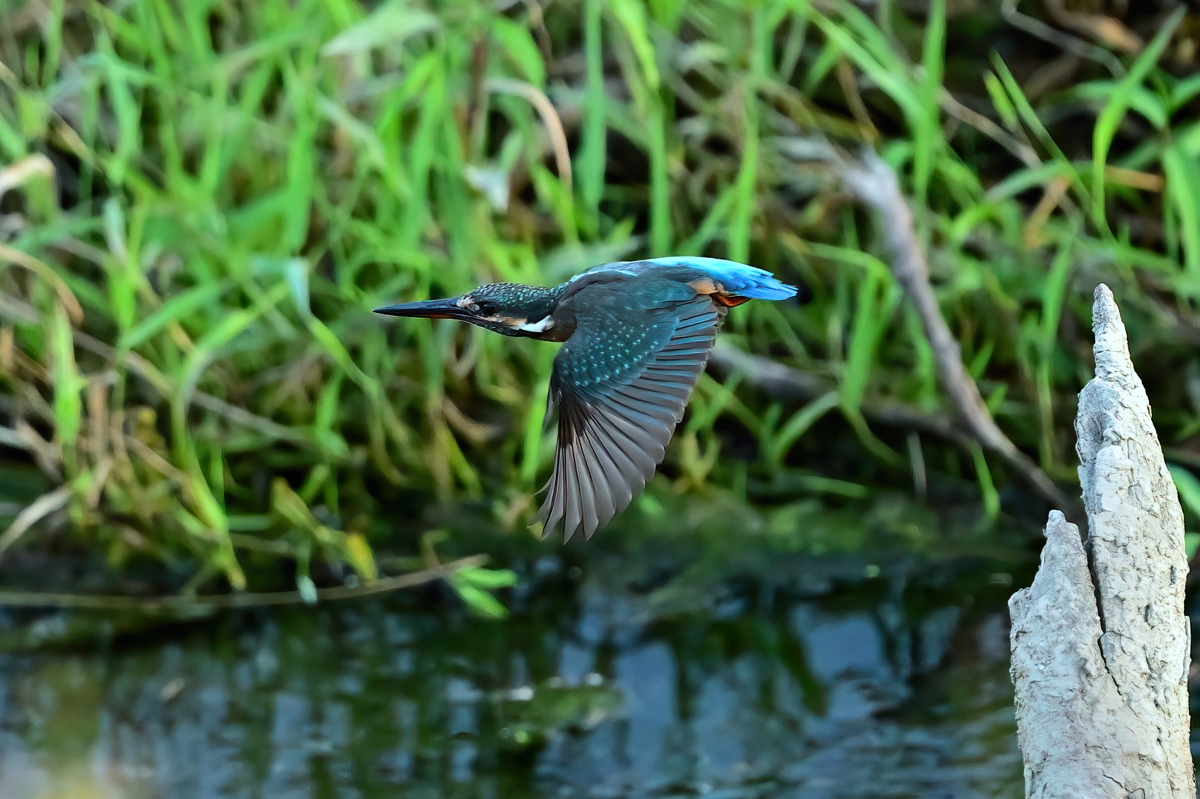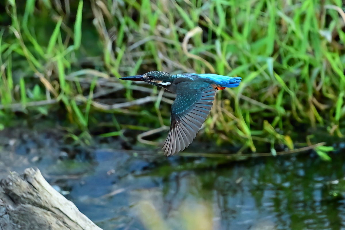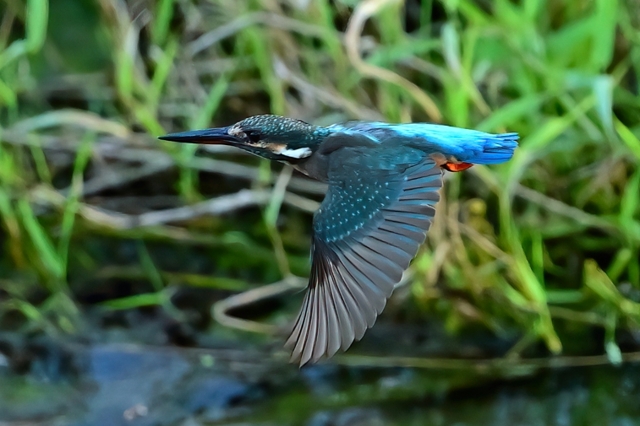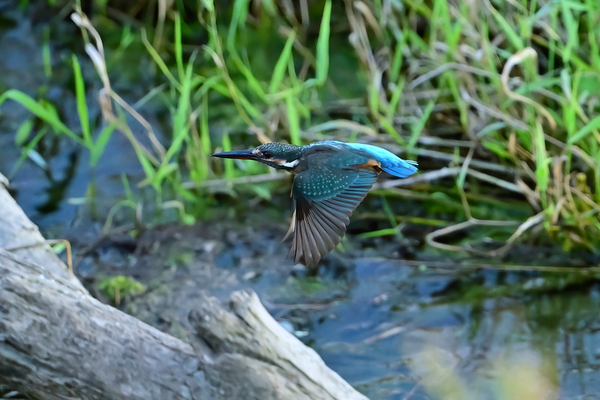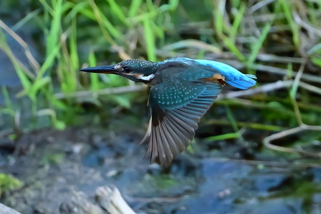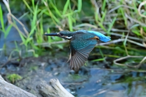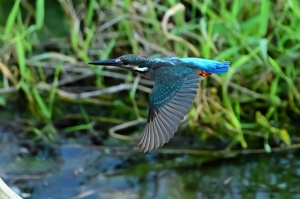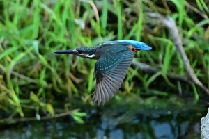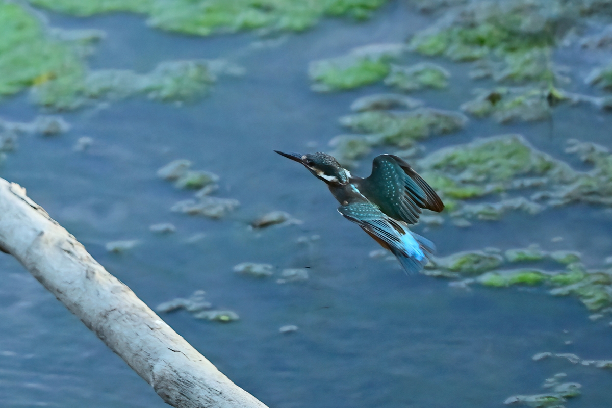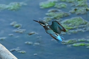 夕方の員弁川。 18時03分に、2羽のカワセミが絡み合いながらの登場。 1羽が去って、残った一羽(メス)が中継ポイント2か所を 次々と経由した飛翔のようすを撮影しました。 これは最近よく撮影している個体のようで、背面は 美しい色合いになっているが、閉じかけた翼の背面は 縁が黒っぽく、胸元も黒っぽい幼い個体のようです。 |