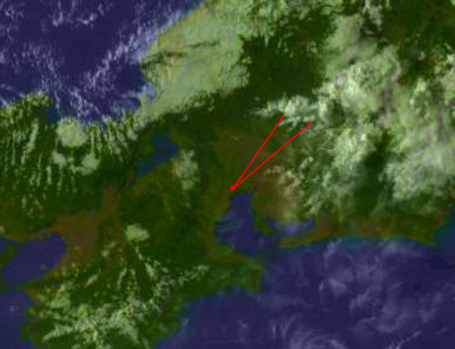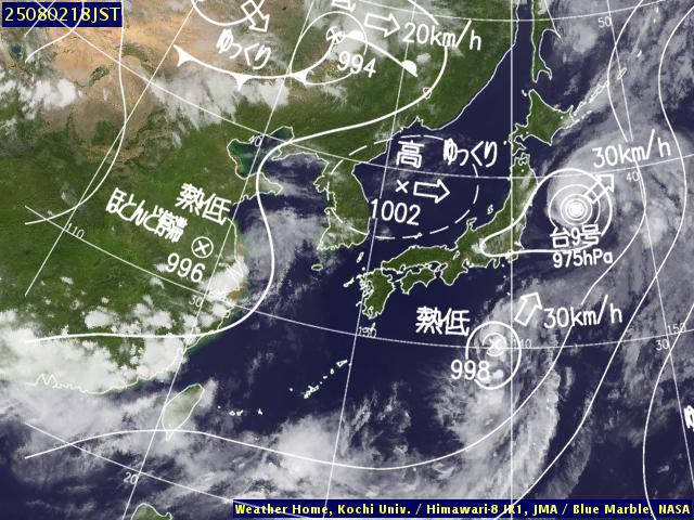 | 地上(高知大学気象情報頁赤外画像と気象庁速報天気図を合成) | |||