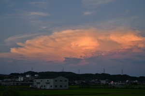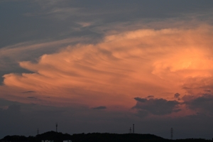 昨日40℃を越えた桑名の今日の最高気温はなんと39.9℃。 日中は、巻雲の流れる青空でしたが、16時ころから北東の空で 急激に積乱雲が発達し始め、東濃地方全体を覆うような積乱雲 群が発生。 桑名から見える範囲でも4つの対流セルを中心に、 繰り返し積乱雲が生じて、やがてマッシブな積乱雲のかたまりと なり、大きな かなとこ雲が出来上がりました。 長時間の観察が つらい暑さの中、日没後にかなとこ雲が赤くなるまで観察しました。 |