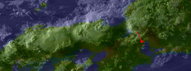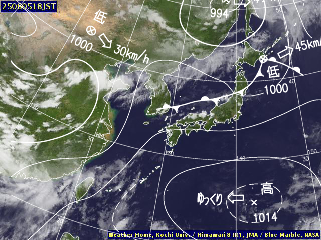 | 地上(高知大学気象情報頁赤外画像と気象庁速報天気図を合成) | |||