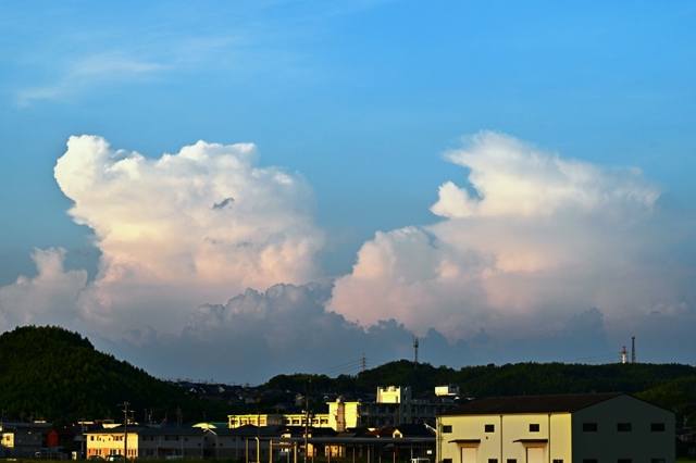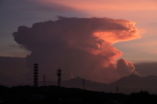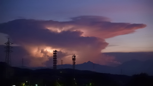 北太平洋高気圧に覆われながらも、午前は層積雲の空。 午後には晴れて巻層雲の。 気温が上昇しました。 夕方、思いがけず北東(東濃方面と西南西(摂津方面)にて 同時に積乱雲が発達し、日没後にみごとな夕焼けに 染まり、遠方にもかかわらず雷が見られました。 |