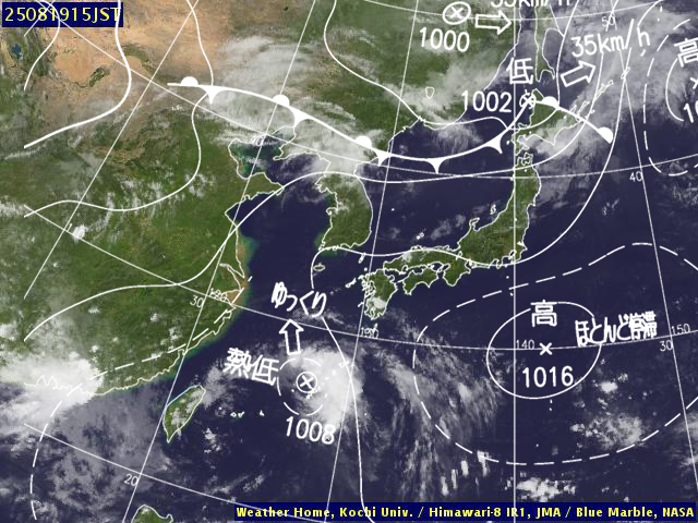 | 地上(高知大学気象情報頁赤外画像と気象庁速報天気図を合成) | |||
