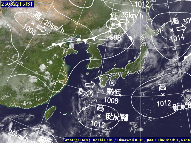 | 地上(高知大学気象情報頁赤外画像と気象庁速報天気図を合成) | |||