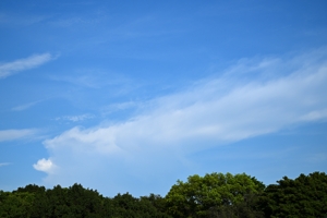 今日もまた、ため息が出るほどの猛暑日(桑名37.5℃)。 台風12号は熱帯低気圧にかわり、そこから上層発散する 上層雲がやってきているようで、昼過ぎには美しい巻積雲。 夕方、中部山岳の積乱雲が低空に見える中で、南西から 流れてくる巻雲に、尾流の美しい乳房雲が見られました。 |