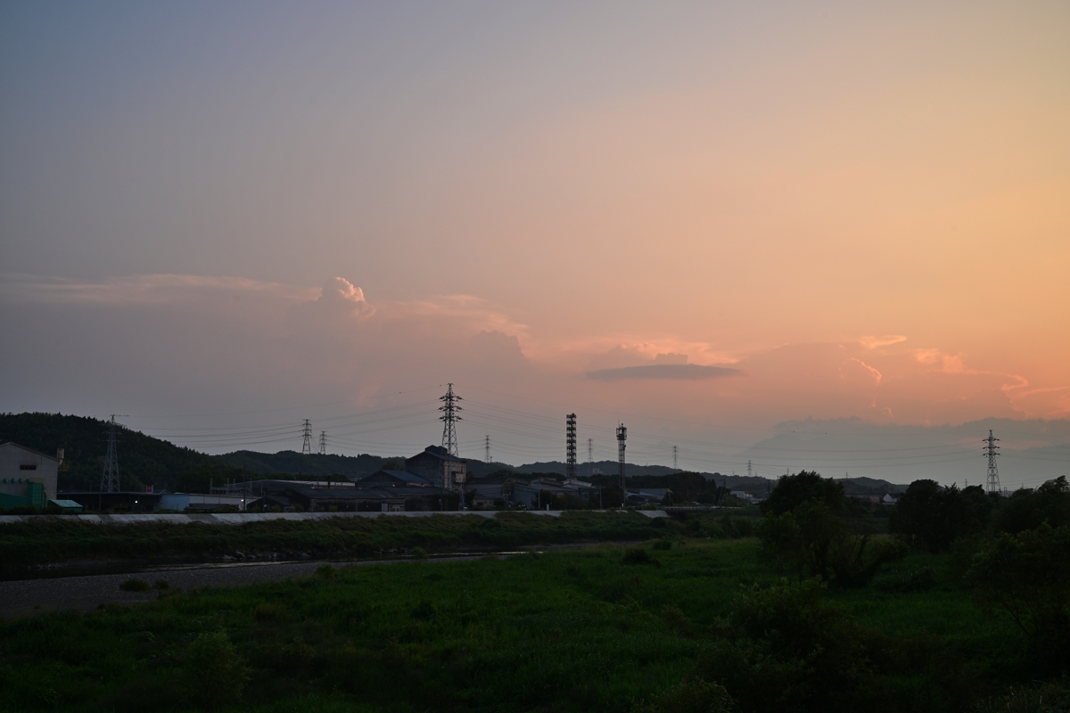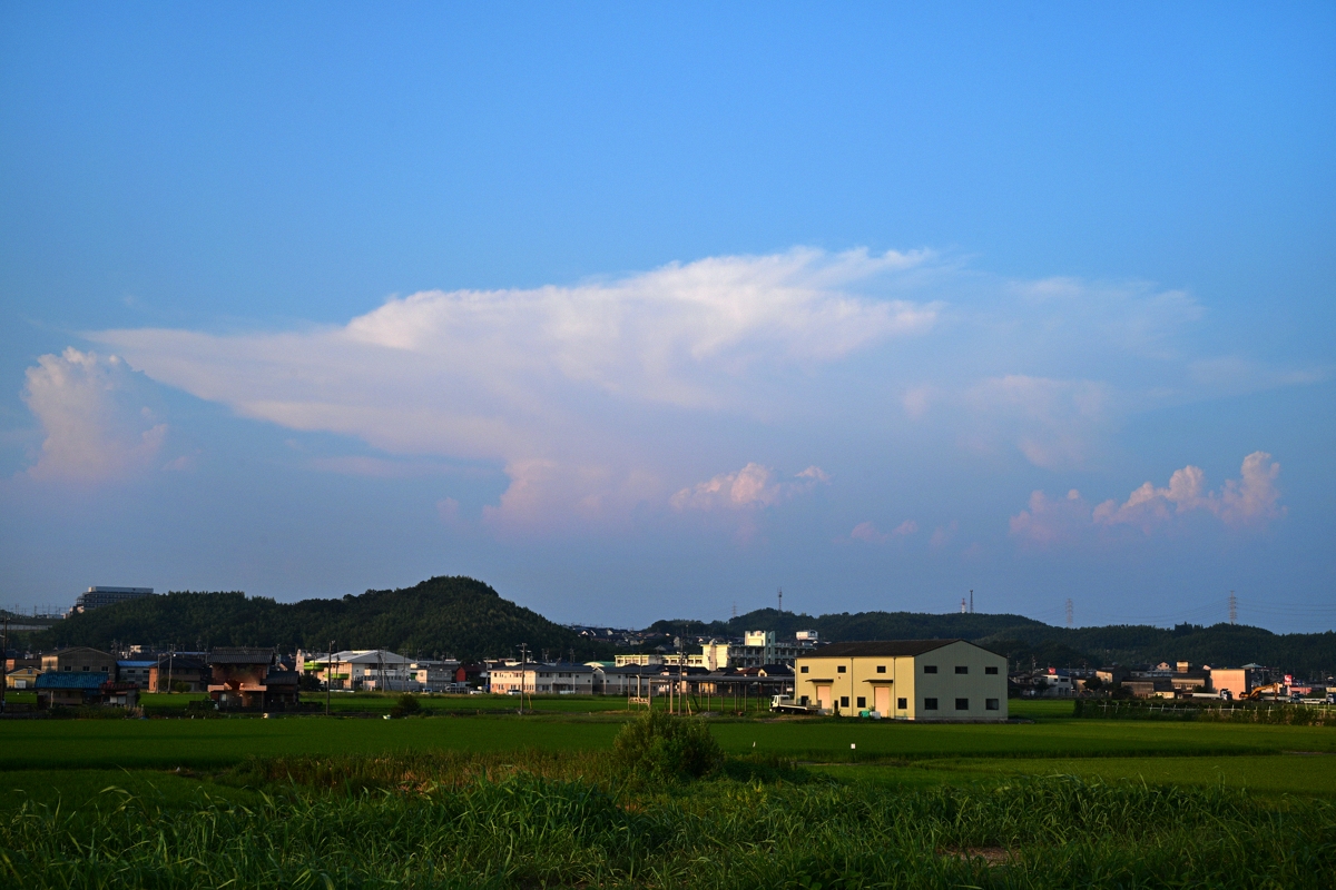 今日も快晴、最高気温(桑名)は37.2°の猛暑日。 夕方に、東(遠江方面)、北東(東濃方面)、南西(奈良県・大阪府方面)に かなとこ雲。 日没頃、北東のかなとこ雲の手前に新しい積乱雲が生じ、 夜のはじめころにはその雲に頻発する雷光が桑名から見られました。 毎日、積乱雲やかなとこ雲の景色を楽しめるのはよいのですが、 桑名ではすでに10日以上も雨は無く、猛暑日が続いており、 そろそろひと雨ほしいな、という気持ちが切実になっています。 |