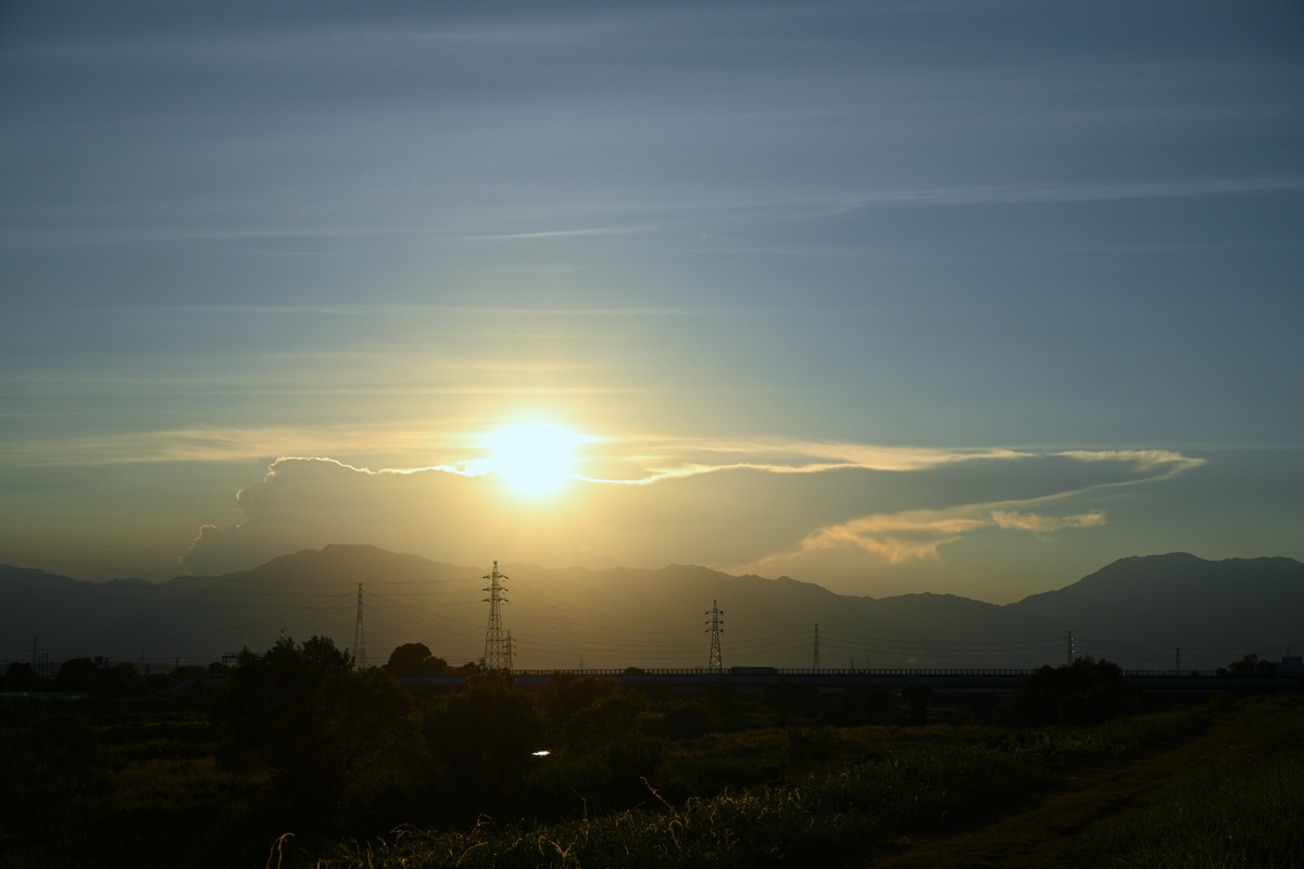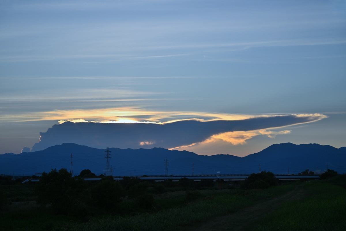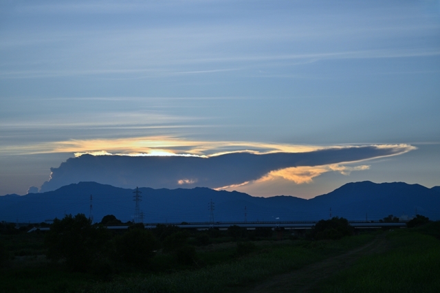 最高気温(桑名)は40.5℃。今月2度目の40℃越えで、全国1位。 桑名が特に高温になるのは西寄りの風が吹く時で、今日も 西北西の風でした。フェーンの影響と報じられてもいますが、 原因となるべき西方の雲や降水は顕著には見えません。 実は体感的に今日は酷暑という感じはなく、アメダスの ロケーション(市街地の熱気が移流している可能性)かも。 夕方の西空にかなとこ雲がシルエットになって見られ、 これは兵庫県のもの。この雲の影として延びる薄明光線や 反薄明光線も衛星画像とぴったりと合致するものでした。 また、美しい巻層雲も広がって、幻日も現れました。 |
