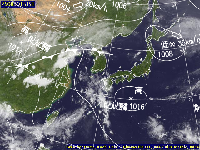 | 地上(高知大学気象情報頁赤外画像と気象庁速報天気図を合成) | |||