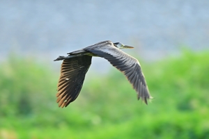 目前を飛翔通過したアオサギは黒っぽい印象。