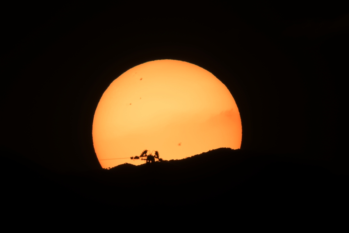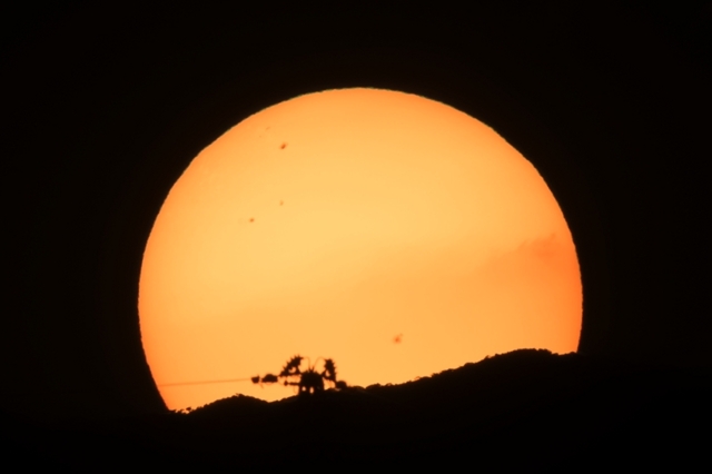 9月1日、今日から秋・・・・とはいきそうになく、今日も最高気温(桑名)は 36.1℃の猛暑日。 ただ、積乱雲は無く、南寄りの風は涼しいものでした。 日没頃に南中を迎えた上弦の月は、高度が低いのが印象的で、これは この時期の上弦の月は、天の赤道の冬至点付近に位置するためです。 鈴鹿山脈に沈んでゆく夕陽に望遠レンズを向けると、太陽黒点は多め。 今、韓国ドラマの「朱蒙(チュモン)」がテレビ放映されており、、 巫女が太陽の中に三足烏が見たというシーンがありましたが、 古来、多くの地方で日没の太陽の中に見える黒点を烏などに たとえて見る伝説が多くあるようです。 |