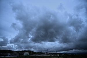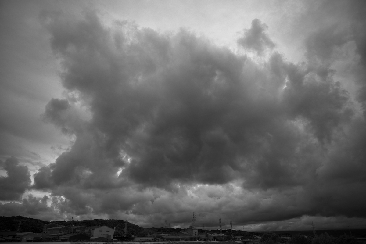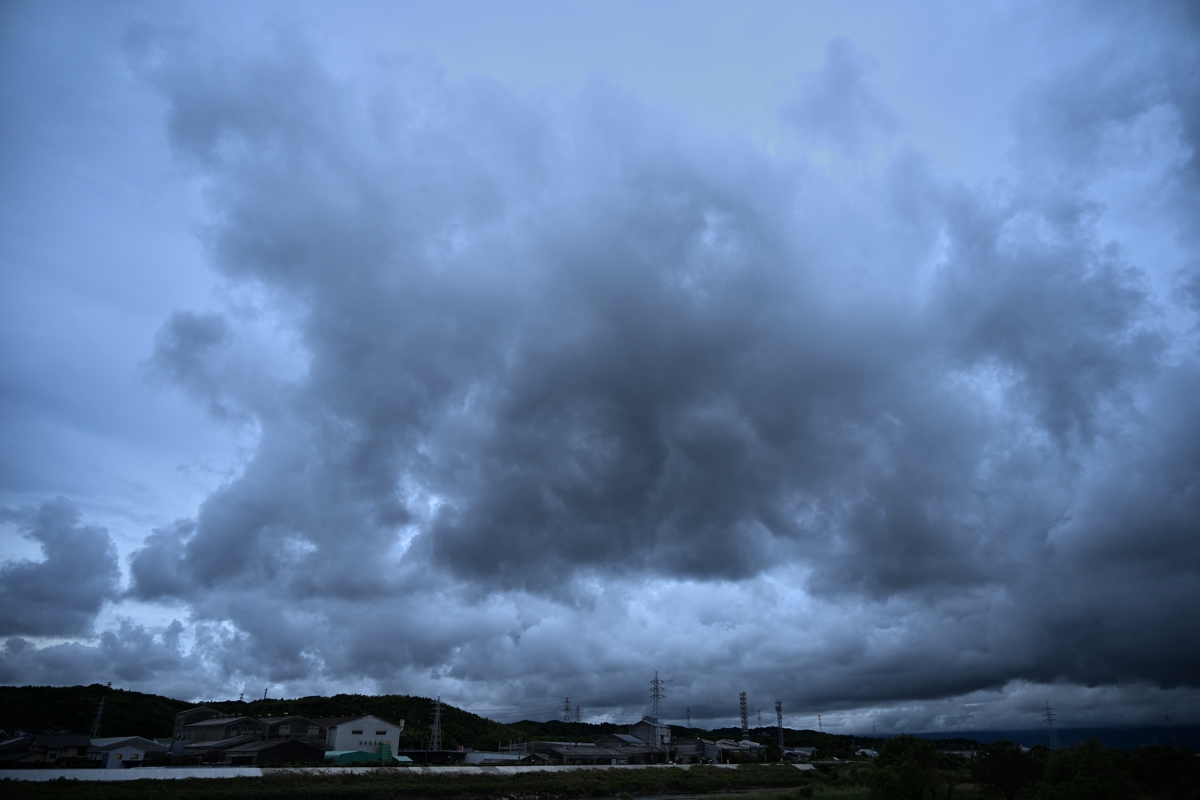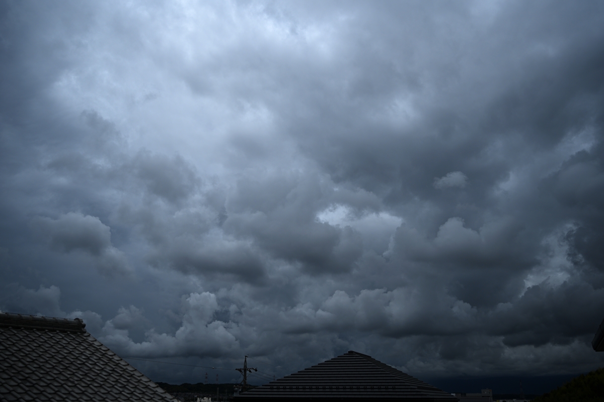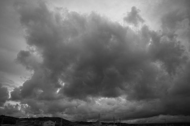 台風15号が接近、今夜に上陸の予想。 台風の中心気圧は1000hPaとたいした勢力ではなく、中心付近の 最大風速がぎりぎり台風の条件に達しているという感じです。 それでも南からの暖湿流で積雲が雄大雲となって押し寄せ、 積乱雲となって雷をもたらす時間帯(昼過ぎ)もありました。 |