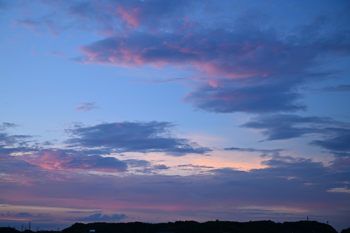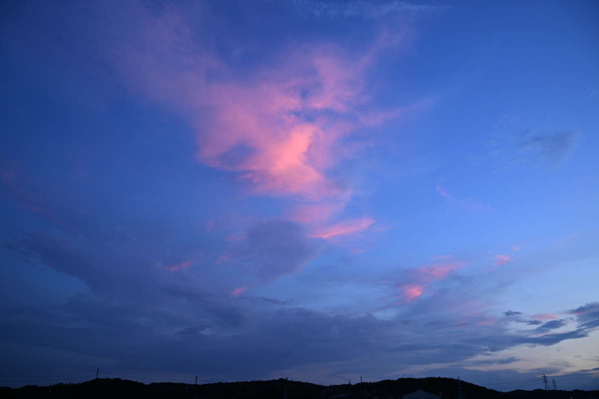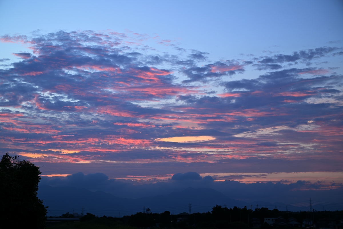 明け方に北陸地方に積乱雲の活動を見せた寒冷前線が 停滞前線となっていすわるかたちになり、これに沿う雲域の 南縁が三重県北部にかかっていて、夕焼けに染まりました。 |