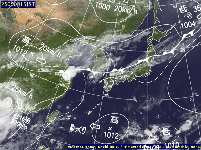 | 地上(高知大学気象情報頁赤外画像と気象庁速報天気図を合成) | |||