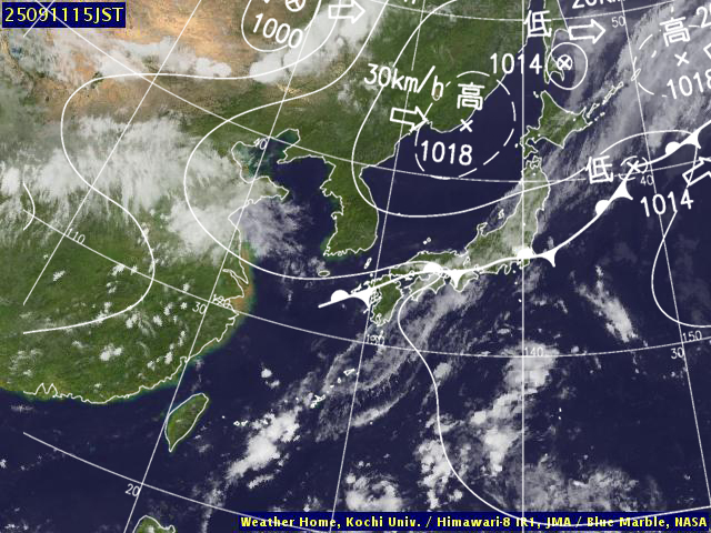 | 地上(高知大学気象情報頁赤外画像と気象庁速報天気図を合成) | |||