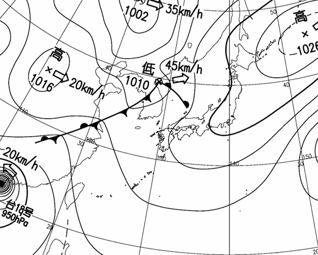 (高知大学気象情報頁赤外画像と気象庁速報天気図を合成)