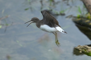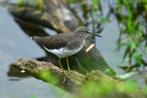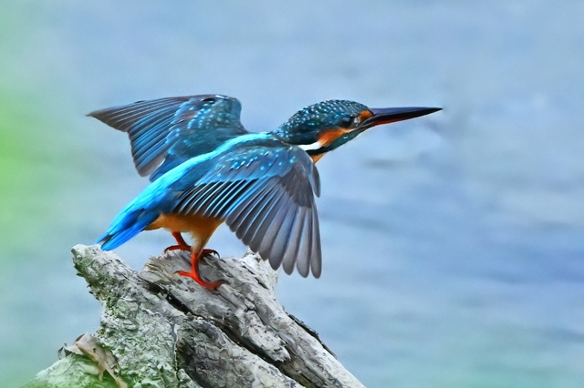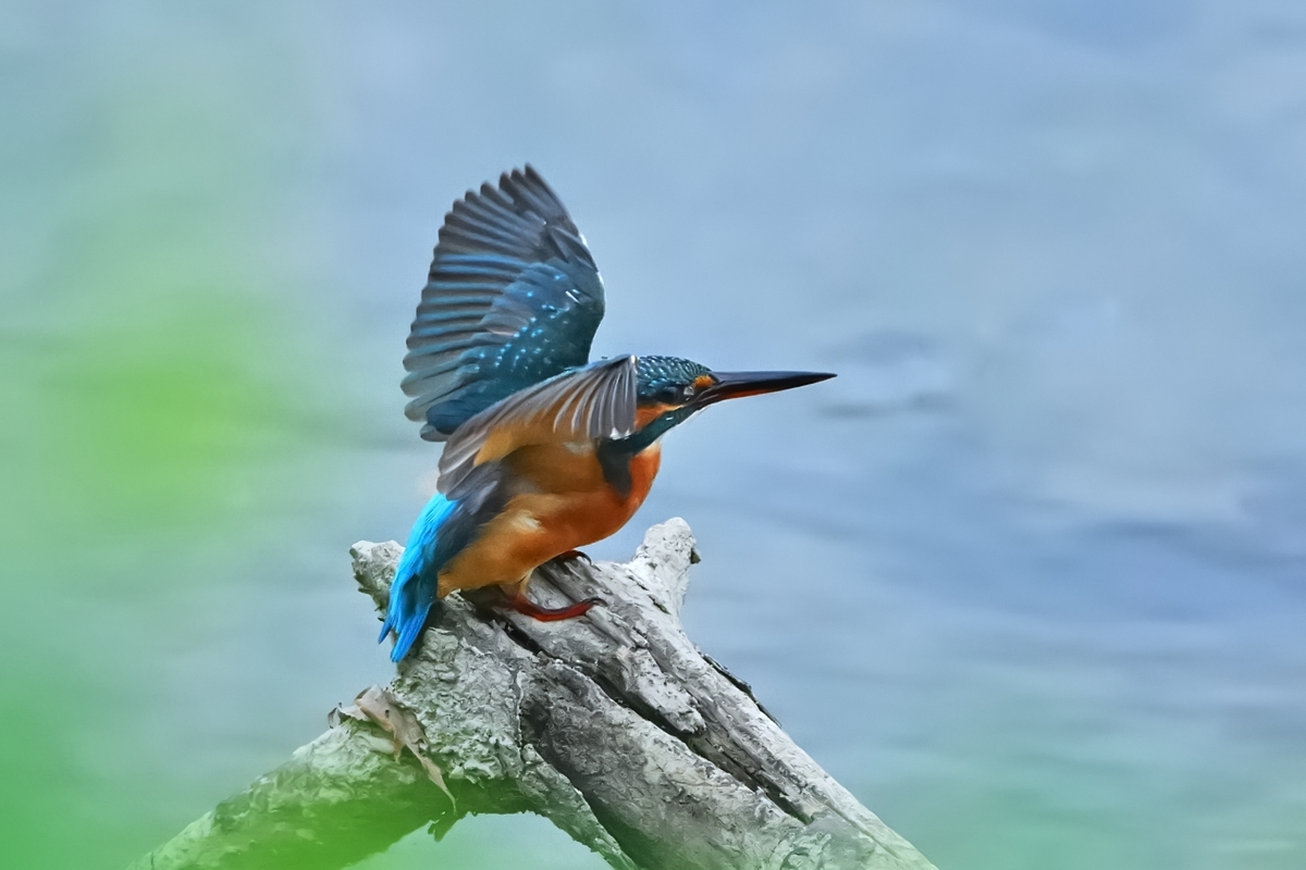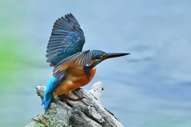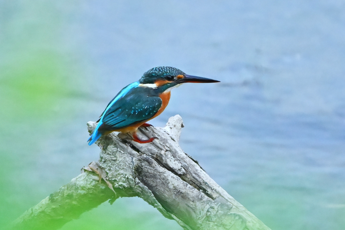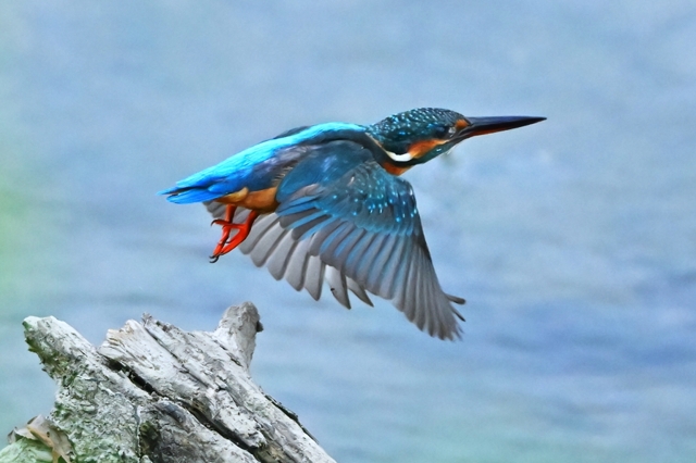 夕方の員弁川。空はどんよりとして小雨も落ちる曇り空。 川面に突き出た倒木に一瞬留まり、ワンタッチで飛び立つカワセミを撮影。 10月1日の幼鳥の個体とは異なり、9月30日の成長に近い個体と同じ色と 毛並の特徴を持っています。(下嘴の根元が少し赤く、完全な成鳥でないかも。) |