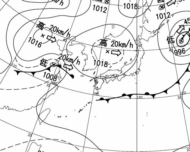 | 地上(高知大学気象情報頁赤外画像と気象庁速報天気図を合成) | |||