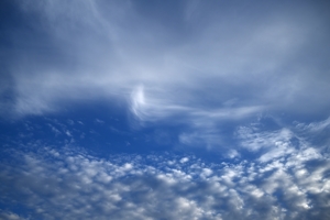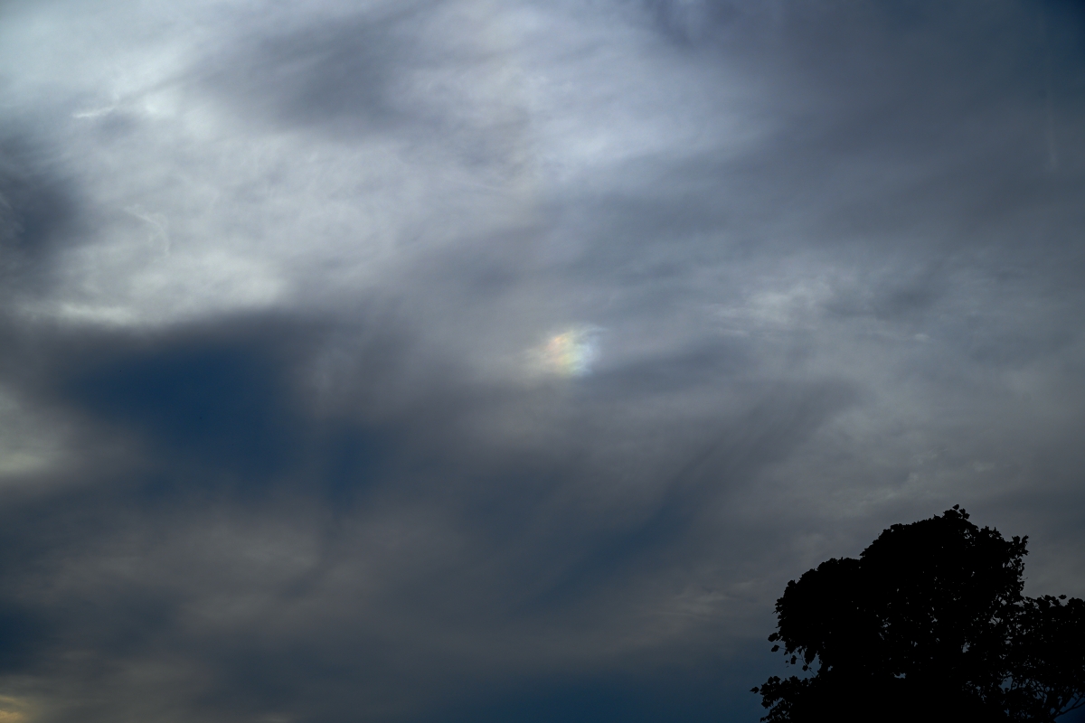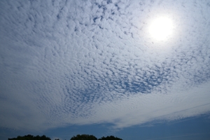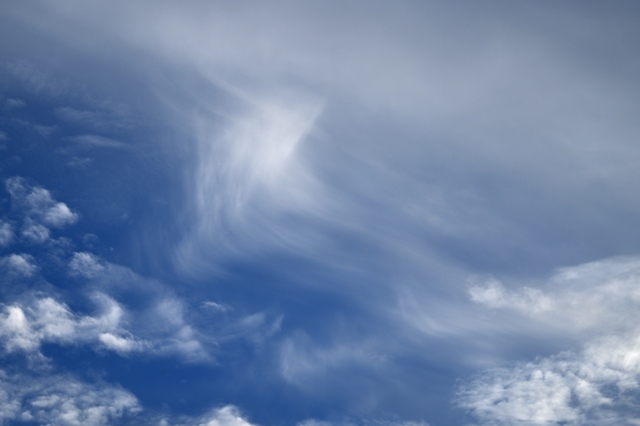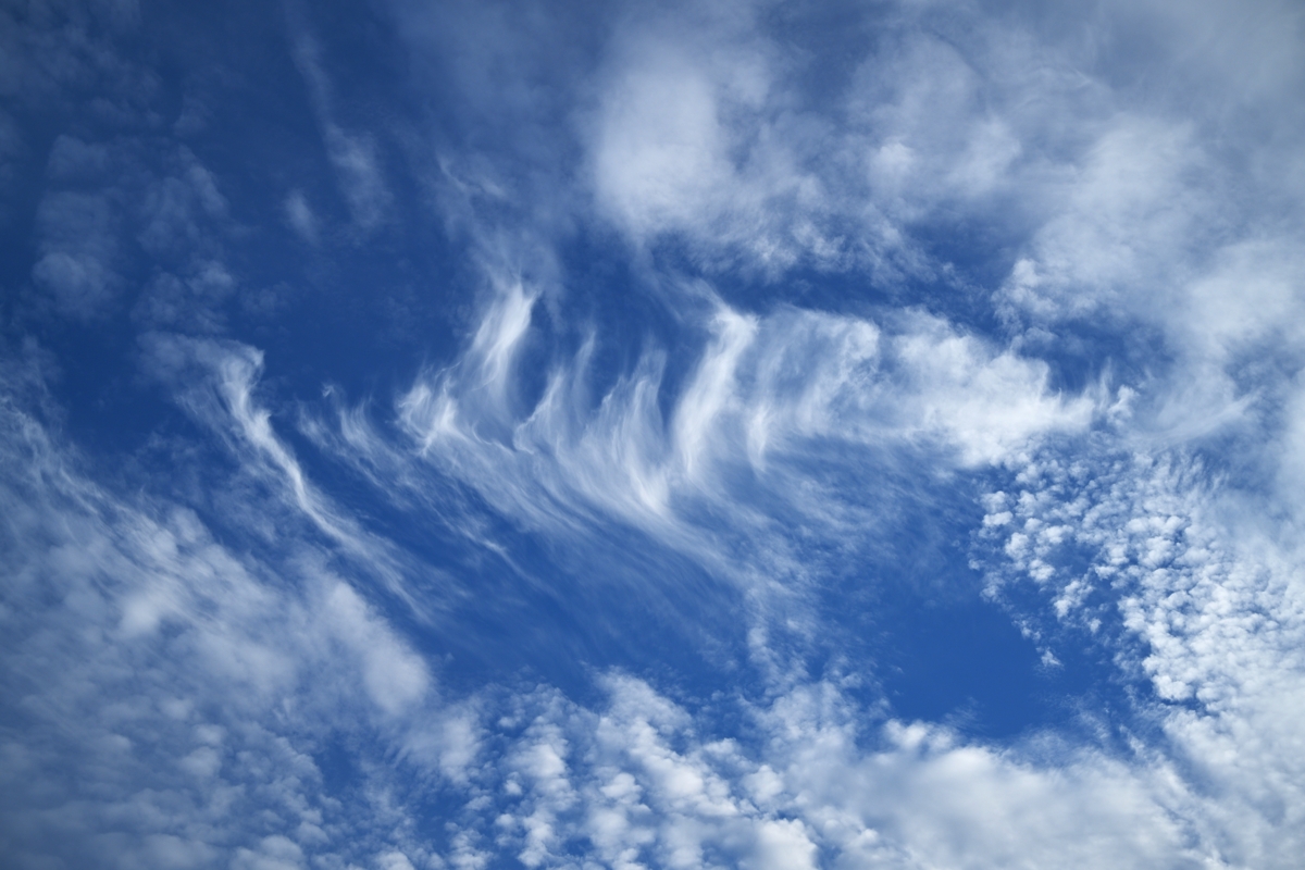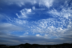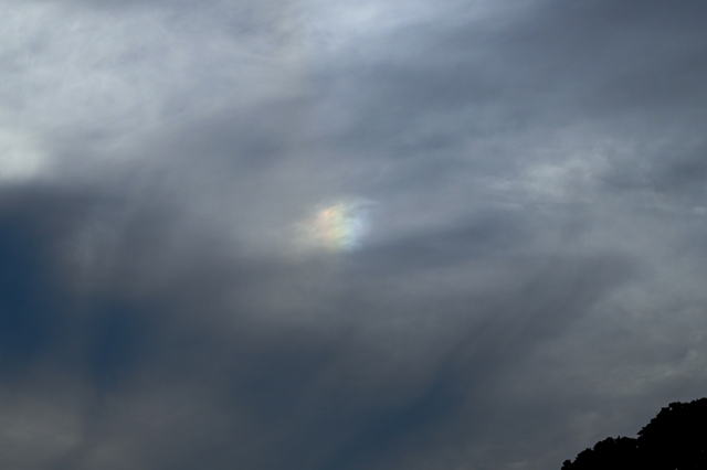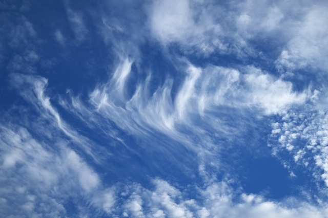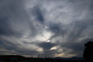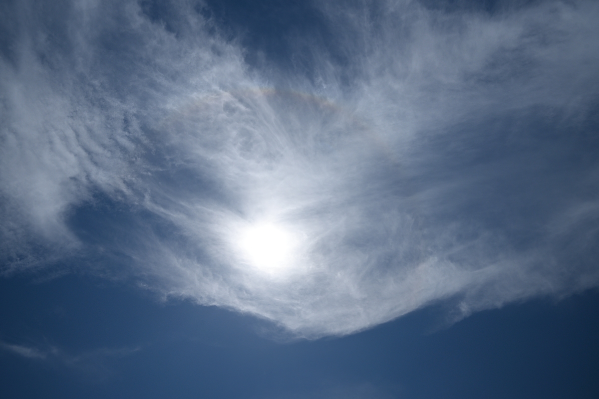 | 高気圧に覆われて晴天でしたが、気圧の谷が近づいており、 中・上層の対流雲や層状雲が混在してにぎやかで美しい空に なりました。夕方は中層から上層の境界付近の雲が多くなり、 雲の種類の判別はなかなか難しい空でした。高層雲の薄い所 には幻日が現れ、いくつかの美しい尾流雲が見られました。 |