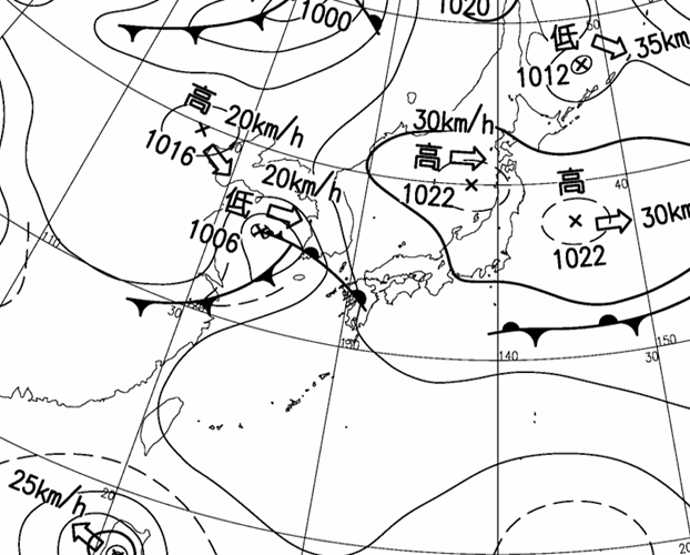| 地上(高知大学気象情報頁赤外画像と気象庁速報天気図を合成) | |||