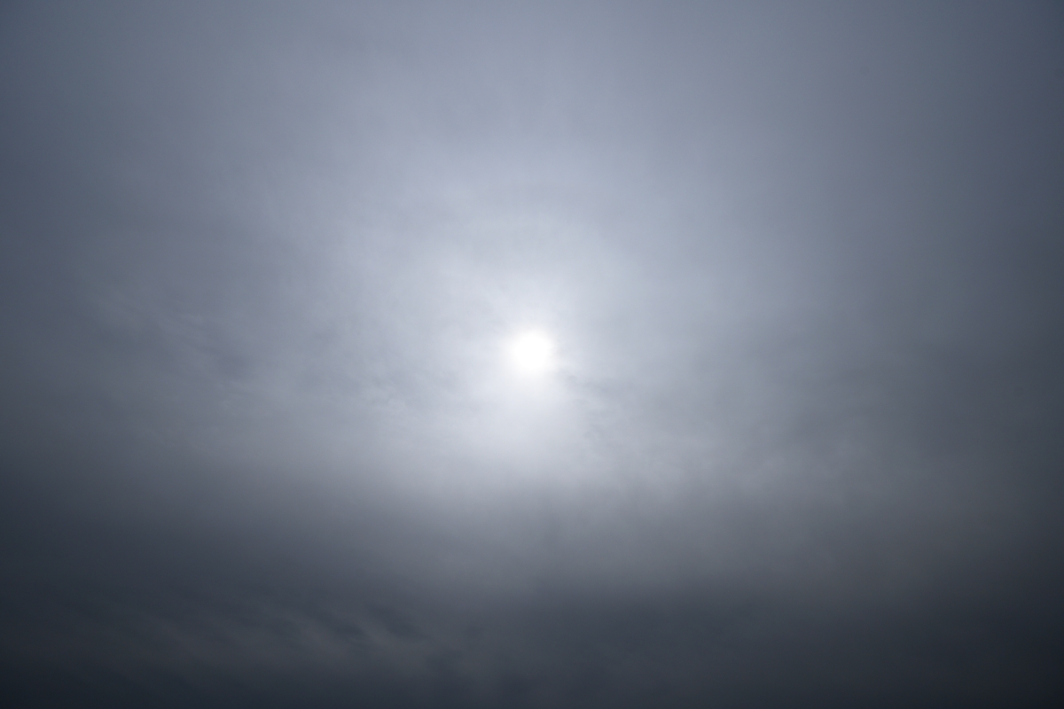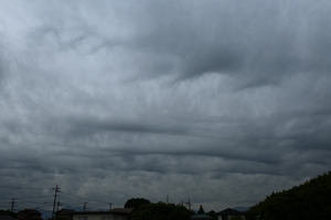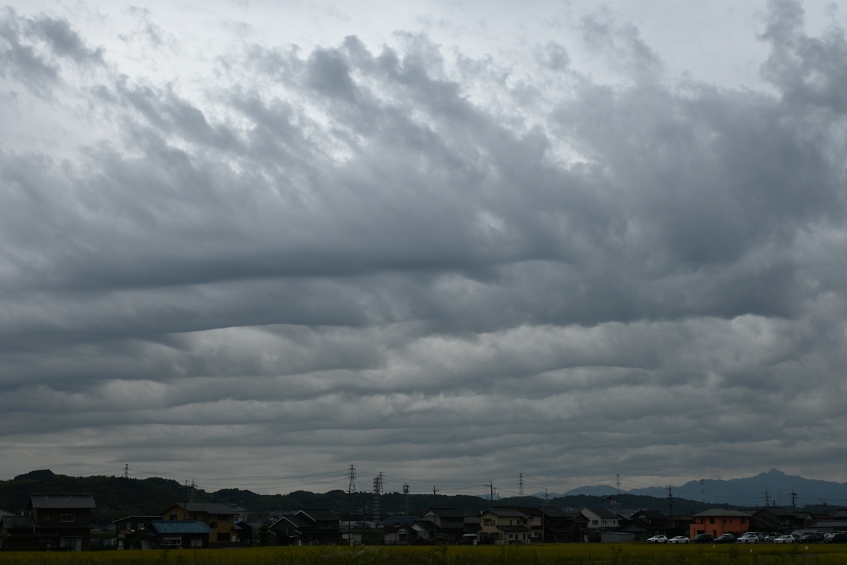 | 温帯低気圧の接近で、天気は下り坂。 昼頃、ほぼ高層雲に淡いタンジェントアーク。 昼過ぎには層積雲が増えて、鈴鹿山脈の山麓に雲底の起伏が 顕著な荒底雲と言ってよさそうな雲。やがて波状雲になりました。 |