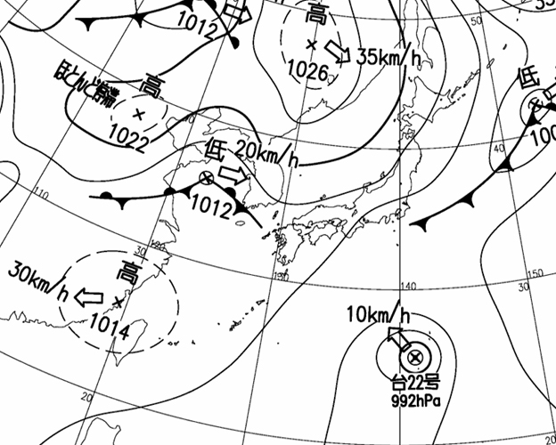| 地上(高知大学気象情報頁赤外画像と気象庁速報天気図を合成) | |||