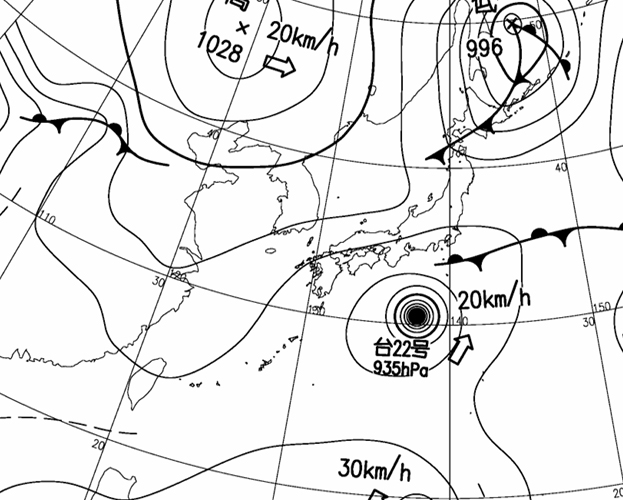 | 地上(高知大学気象情報頁赤外画像と気象庁速報天気図を合成) | |||