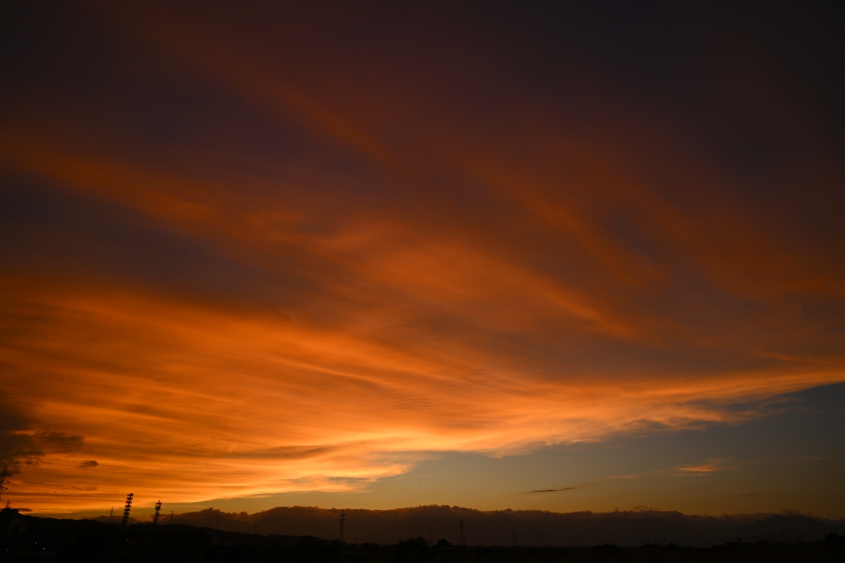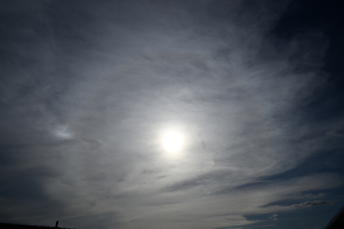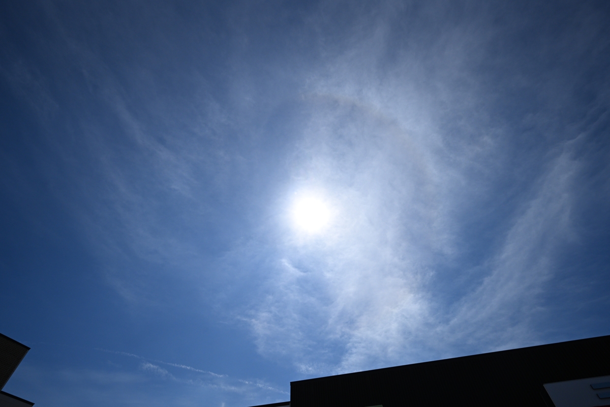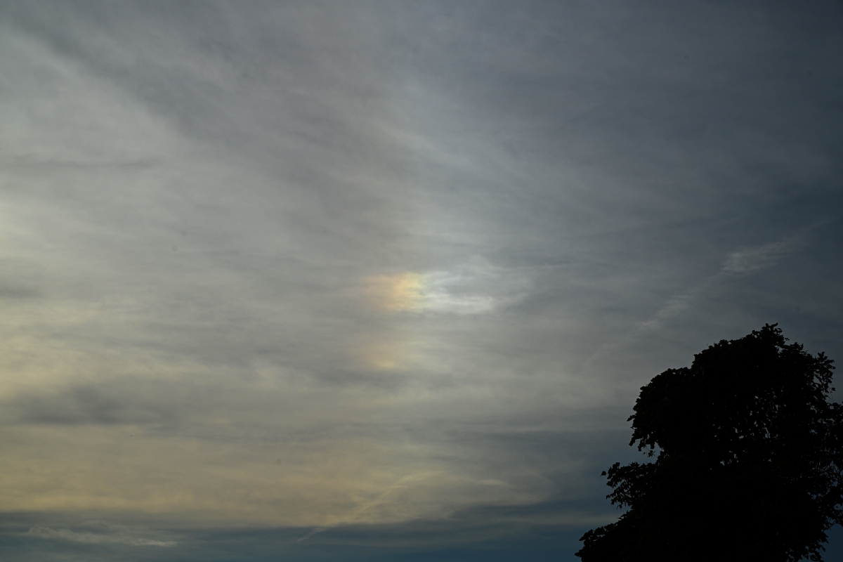 | 大衆22号は非常に強い勢力になり、伊豆諸島に接近。 東海地方には台風縁辺の中上層雲がかかりました。 昼過ぎ、太陽高度が45°の時刻に幻日が現れました。 けっこう高い高度に現れた幻日ですが、幻日の現れる 太陽高度の上限は約60°でまだまだ余裕のある高度。 夕方には高層雲に近いような暑い巻層雲が複数の高度で 広がり、フィルターを通したようなかすんだ幻日が長時間 現れ、日没後は全天が赤く染まる夕焼けとなりました。 |