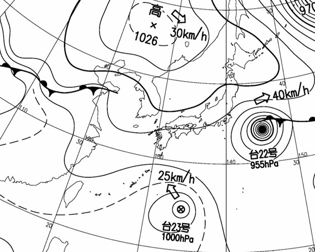 | 地上(高知大学気象情報頁赤外画像と気象庁速報天気図を合成) | |||
