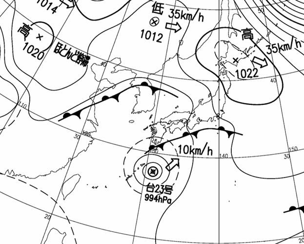 台風23号の縁辺流で運ばれた暖気が南岸に停滞前線を