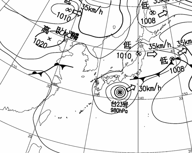 | 地上(高知大学気象情報頁赤外画像と気象庁速報天気図を合成) | |||