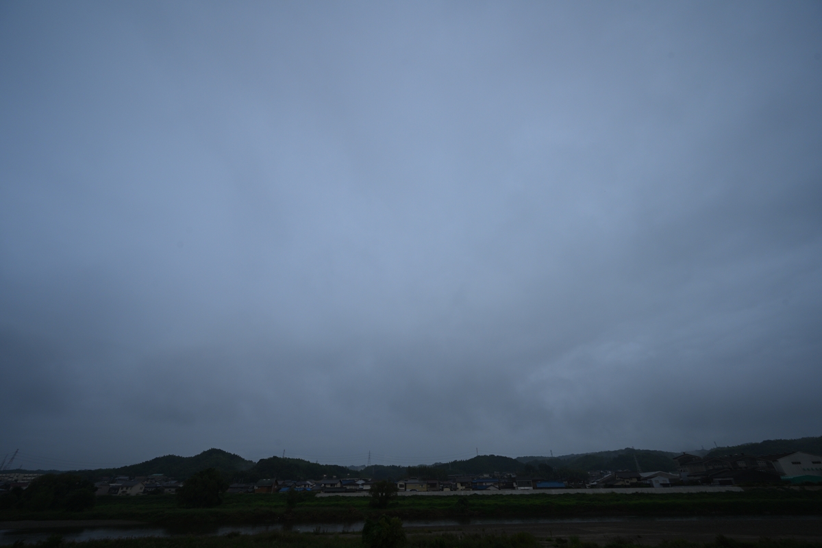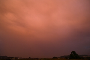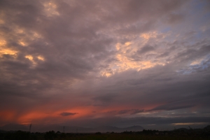 | 台風23号が紀伊半島沖を通過している頃、断続的に雨が 降り続いていました。日没の夕焼けの光が西から漏れ出て 来たのを背景にして降水雲のシルエットが浮かび上がりました。 |