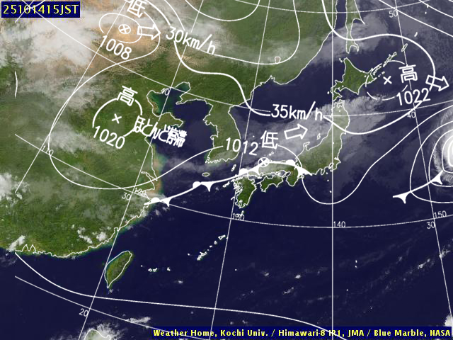 | 地上(高知大学気象情報頁赤外画像と気象庁速報天気図を合成) | |||
