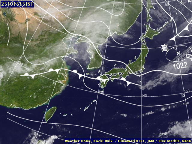 | 地上(高知大学気象情報頁赤外画像と気象庁速報天気図を合成) | |||