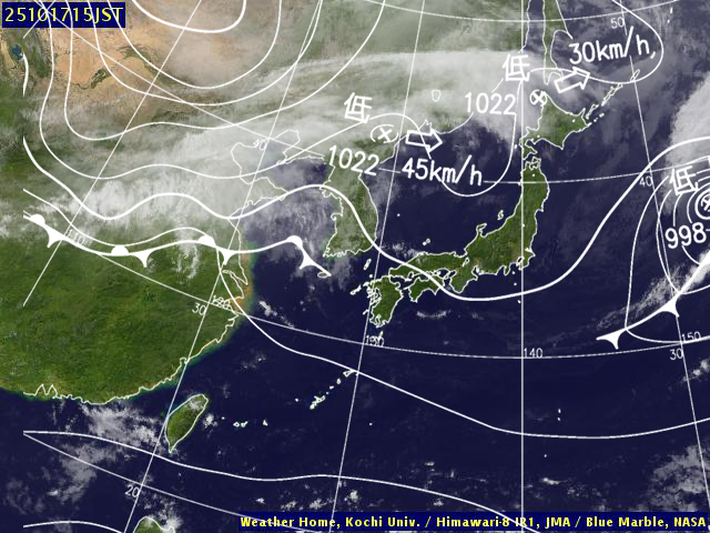 | 地上(高知大学気象情報頁赤外画像と気象庁速報天気図を合成) | |||