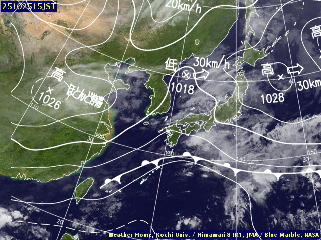 (高知大学気象情報頁赤外画像と気象庁速報天気図を合成)