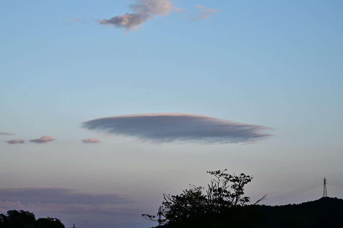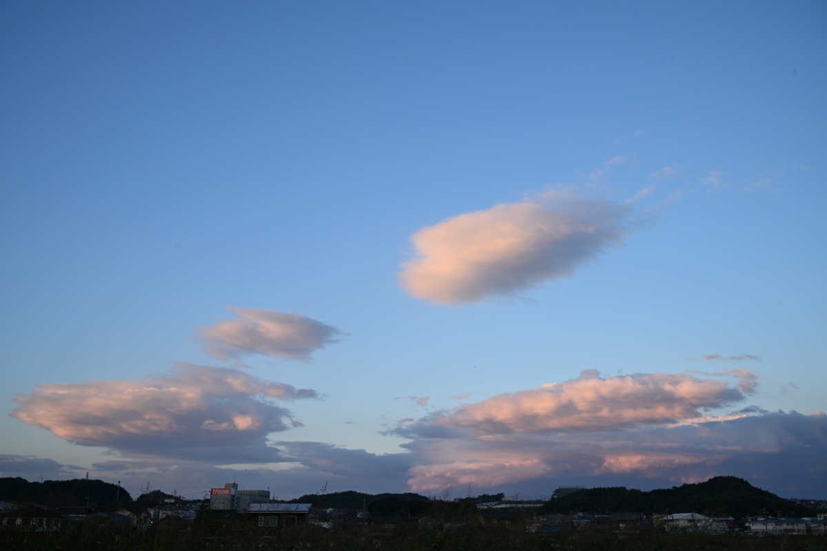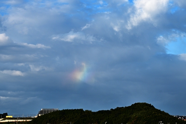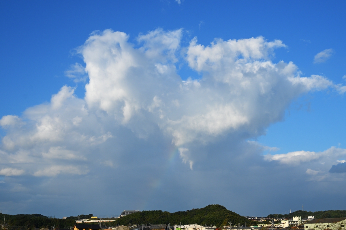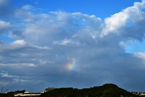 | 低気圧・前線の通過で寒気が流入。一時的に西高東低の冬型の 気圧配置となりました。 澄んだ青空に少し冬を思わせる積雲の 列や地形性の積層構造の雲が見られる中、夕方の北の空には 蒸発して崩壊してゆく積雲の下に短い虹(株虹)が現れました。 晩秋から冬の初めにかけてよく見られるもので、秋の終わりを 思わされるひとときですが、また秋らしい陽気は戻ってきます。 |