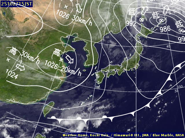 | 地上(高知大学気象情報頁赤外画像と気象庁速報天気図を合成) | |||