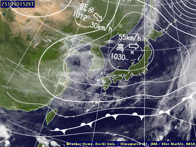 | 地上(高知大学気象情報頁赤外画像と気象庁速報天気図を合成) | |||