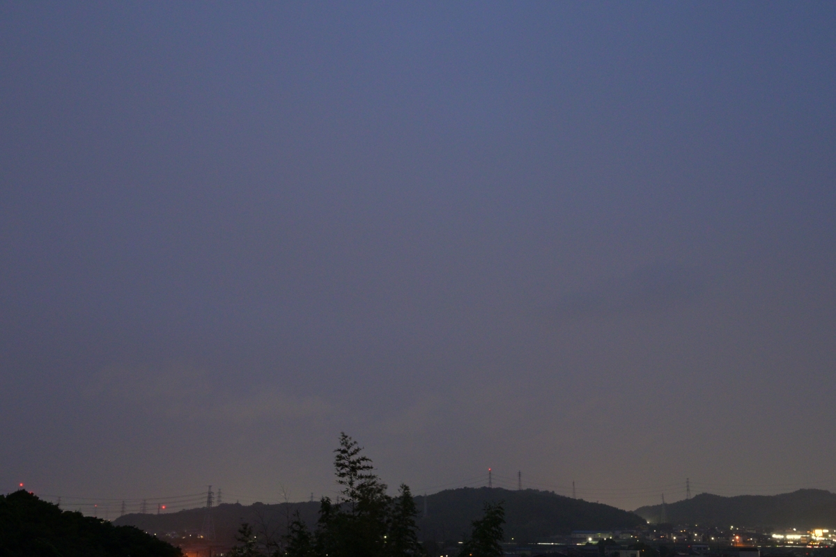 | 秋雨前線からつづく停滞前線がいすわり、雨・曇りの多かった10月。 これをしめくくるように、南岸低気圧が潮岬付近を通過。風は北よりで 冷たく、昼前に降り出した雨は夕方に少し強まりました。写真は町明かり の輝きだした日没後、西方からの光をわずかに反映した乱層雲の空。 |