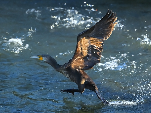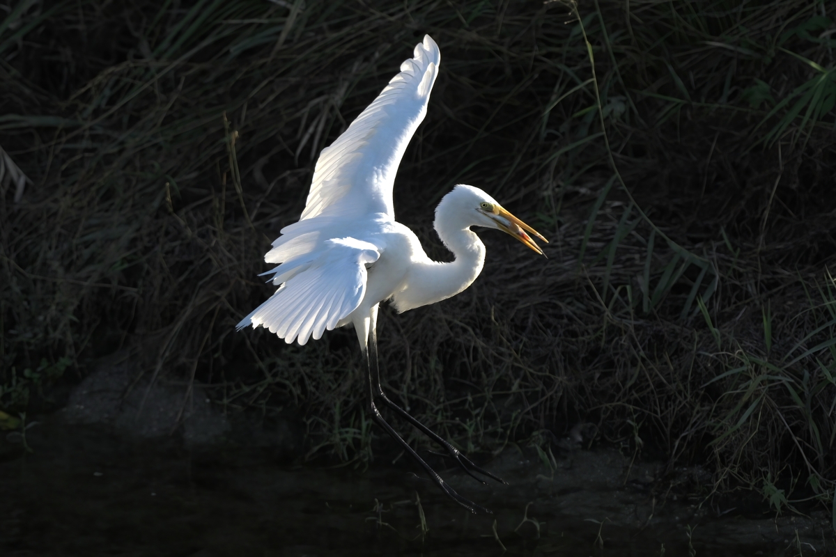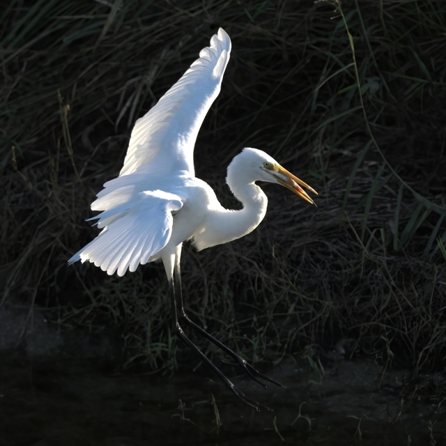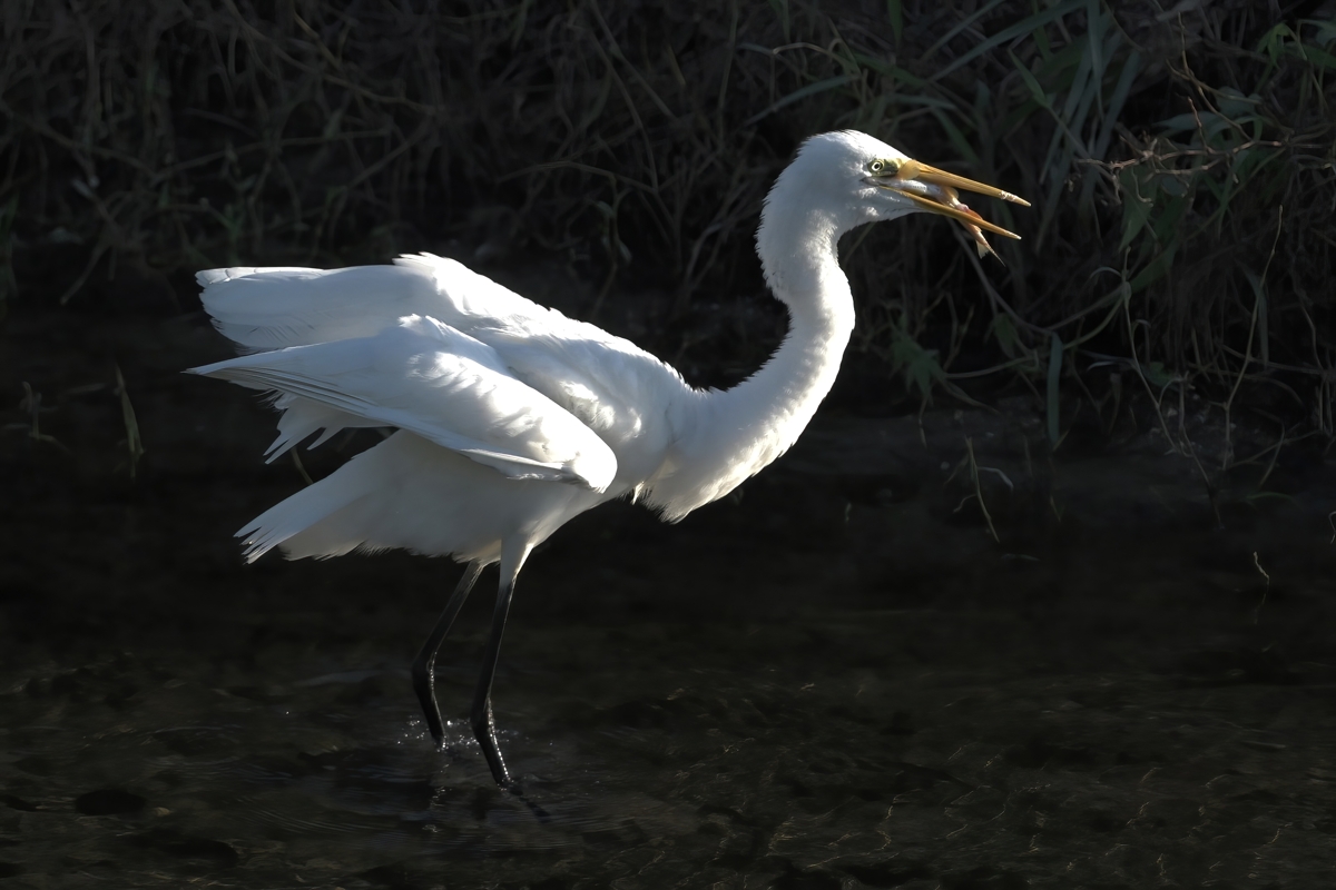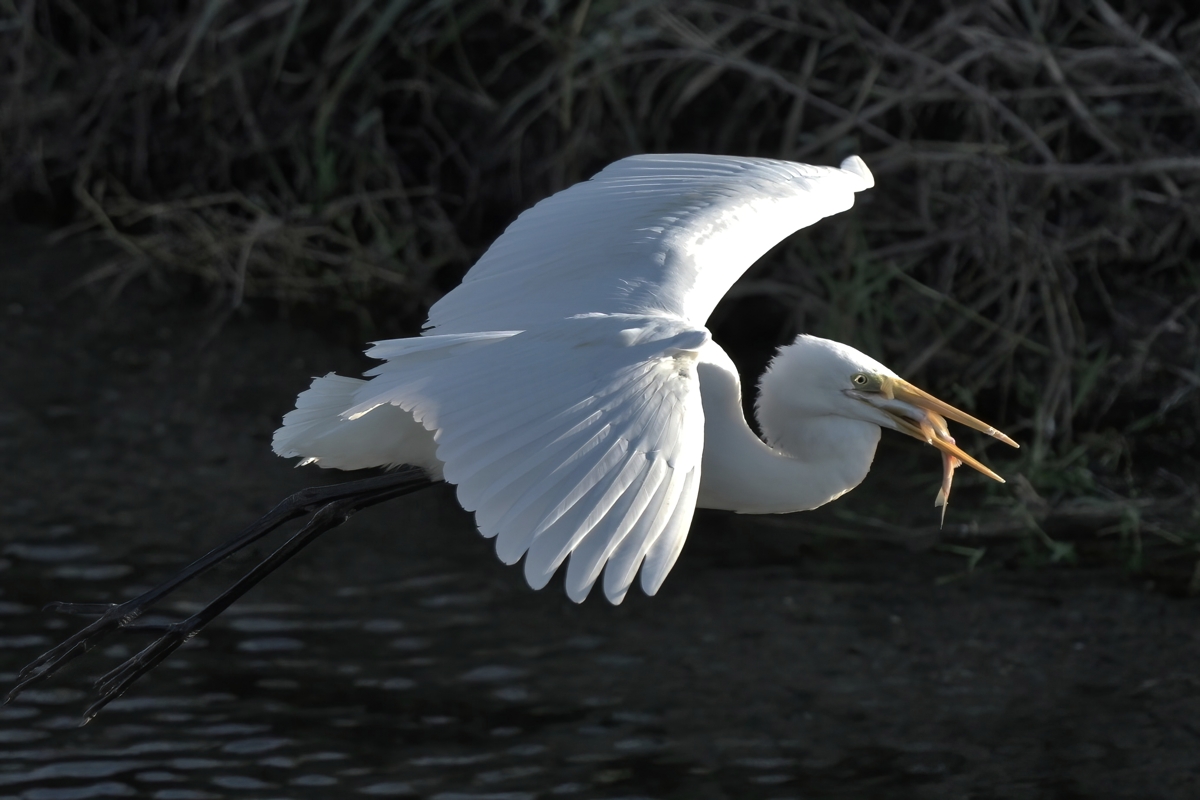 | アユを捕食するダイサギ | 半逆光で翼が美しい。 | ||