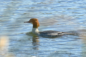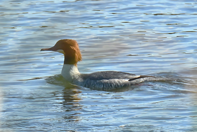 遠方に,ダイサギとともに数羽のカワアイサがいました。