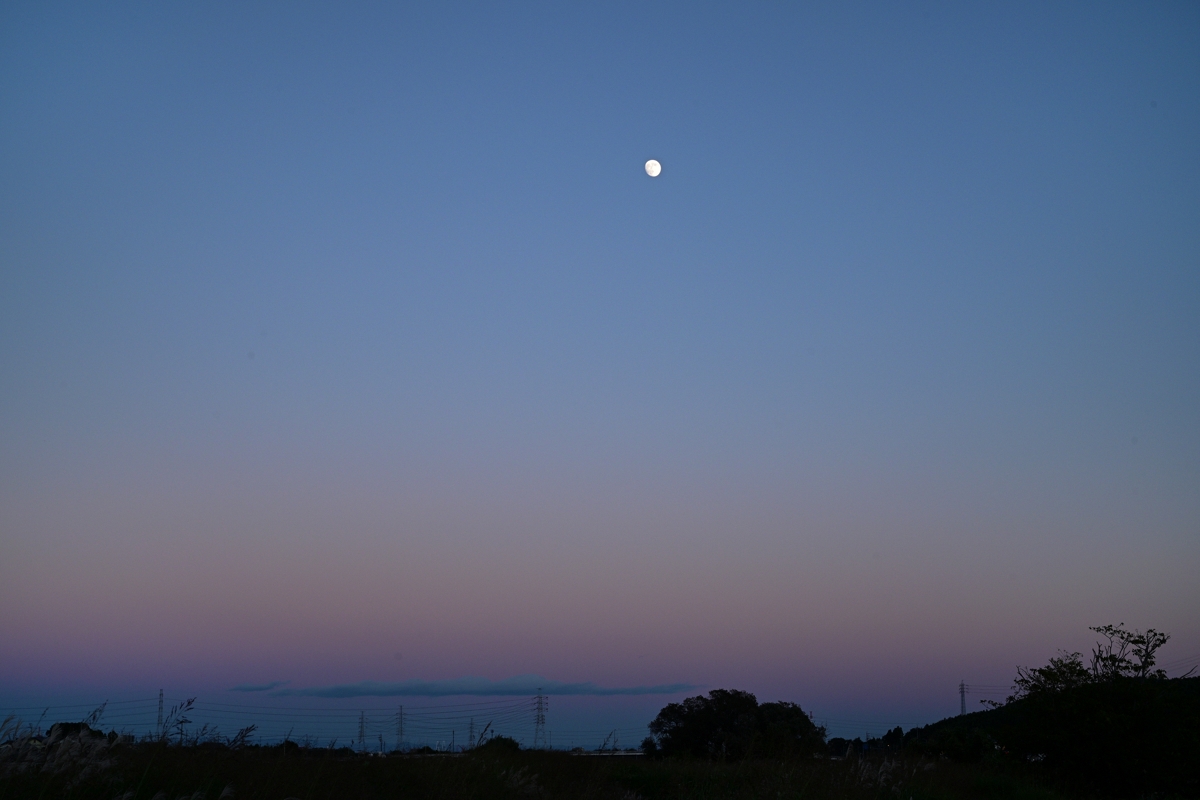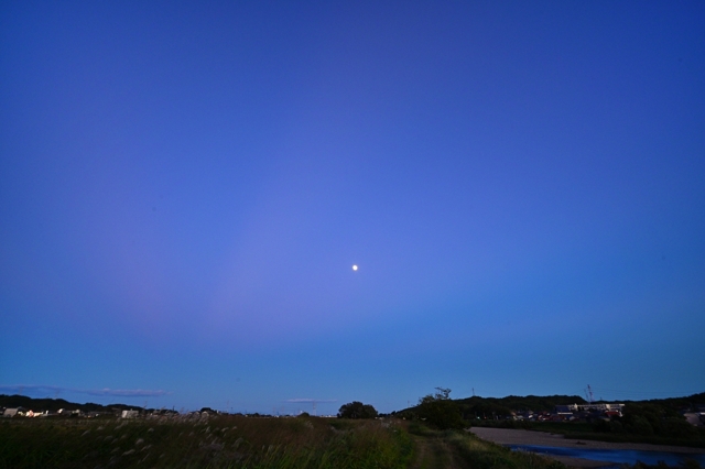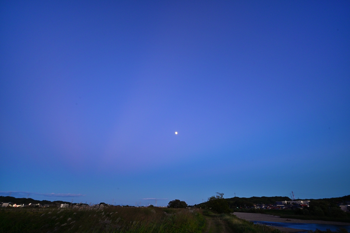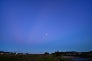 高気圧が覆ってきて快晴。鈴鹿山脈に積雲がかかる程度の雲。 日没後、東の空は、反薄明光線の中に月齢12.8の月が昇り、地球影の グラデーションが美しい空。 一方、西の空はこれにつながる薄明光線。 反薄明光線の方が少し先に顕著になり、遅れて薄明光線が目立ってきます。 |