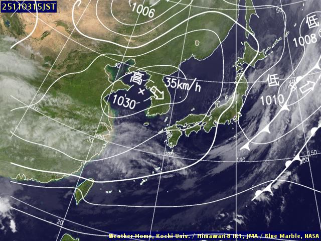 | 地上(高知大学気象情報頁赤外画像と気象庁速報天気図を合成) | |||