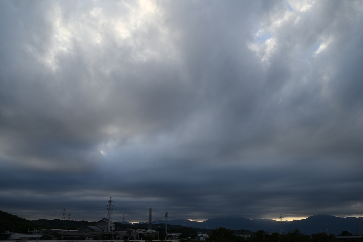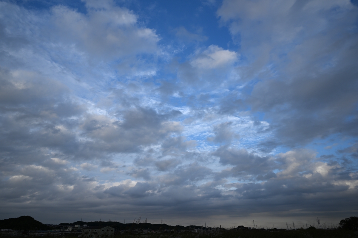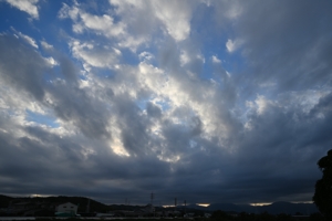 地上では弱い北風が吹きましたが、空を低く覆った層積雲は 東から西へ移動しており、鈴鹿山脈にぶつかることで、性状の 異なる雲が生じました。山脈から離れたところは隙間雲で、 山脈に近づくにつれて厚みを増しつつ、蜂の巣状雲となり、 山脈の近くでは雲底に波打つような起伏をもつ荒底雲ぎみ になっていました。夕方、層積雲が薄くなってくると、上空の 高積雲や巻積雲も垣間見られました。 |