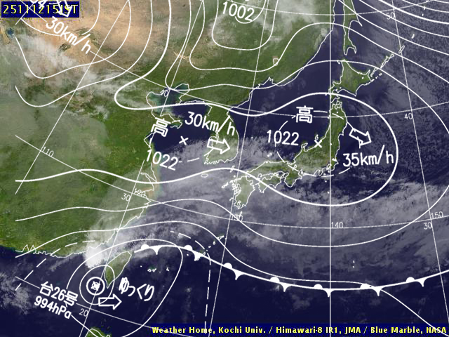 | 地上(高知大学気象情報頁赤外画像と気象庁速報天気図を合成) | |||