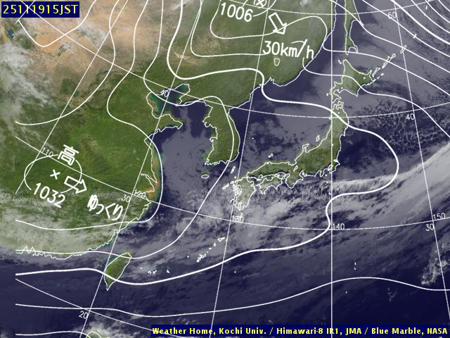 | 地上(高知大学気象情報頁赤外画像と気象庁速報天気図を合成) | |||