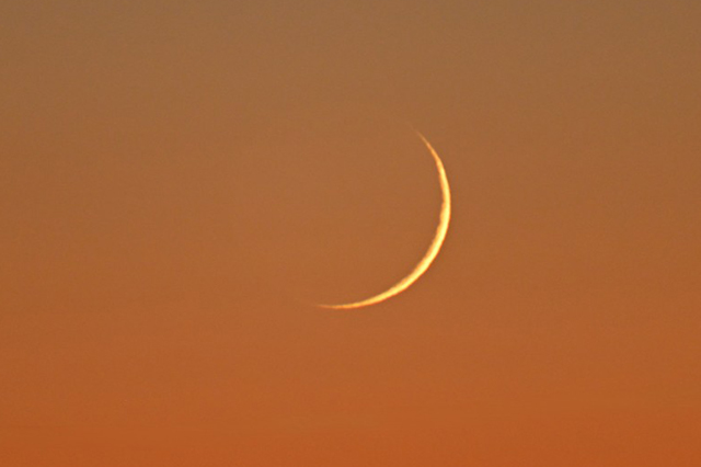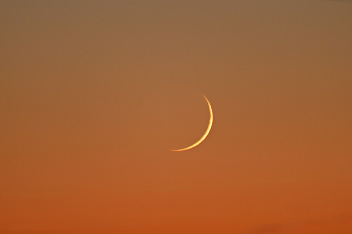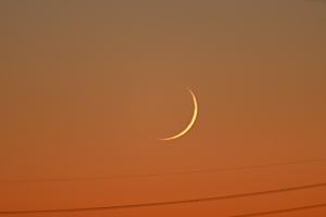 | 移動性高気圧が広く覆ってきて、4日連続の晴天、小春日和の陽気です。 日没後、オレンジ色の夕焼けの中に、月齢2.0の細い月が見えていました。 |