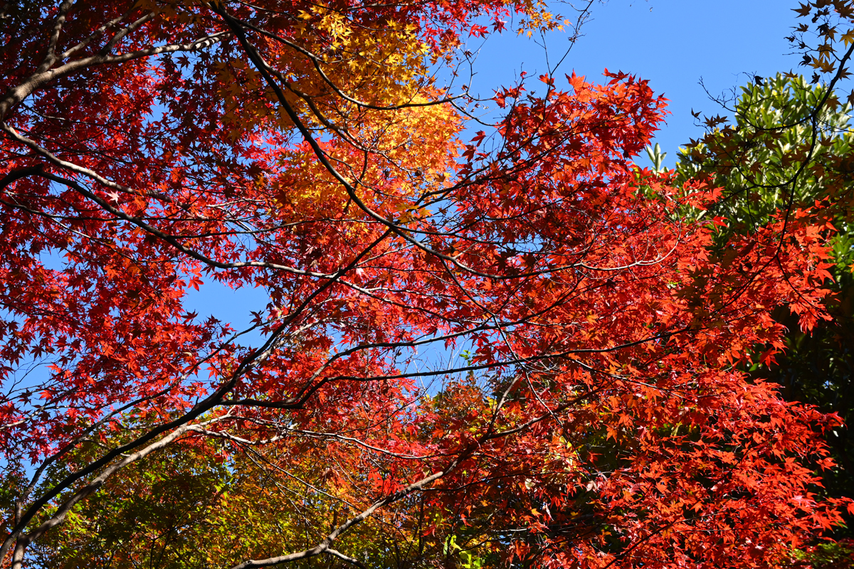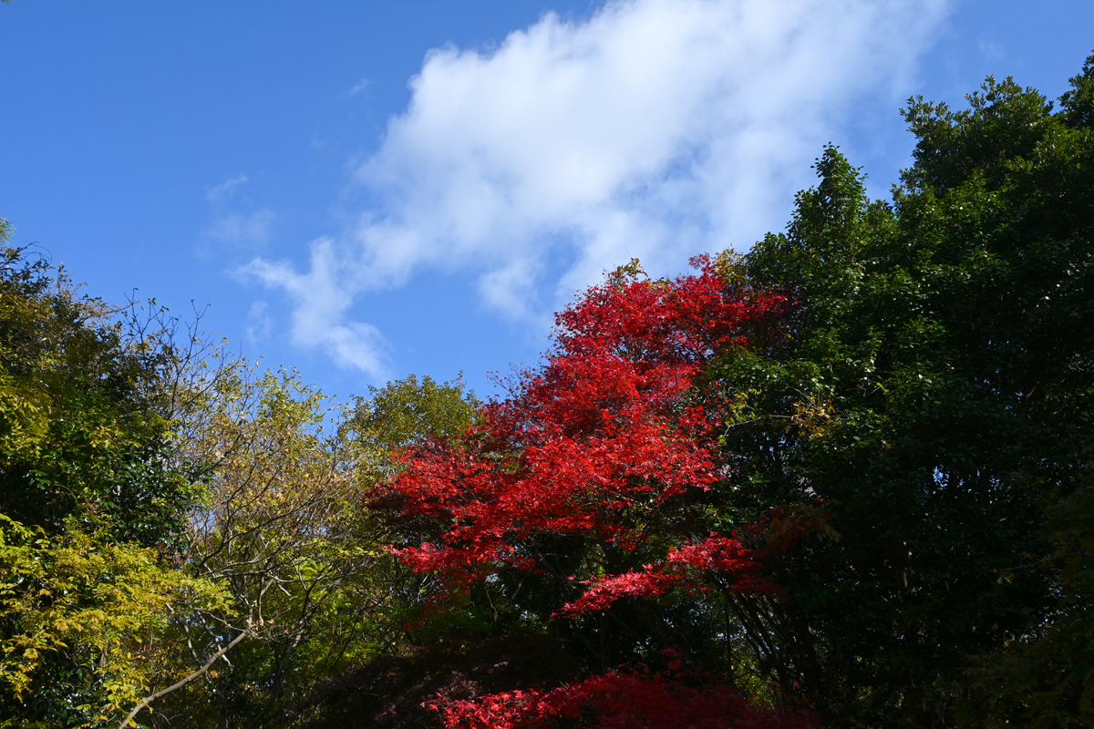 | 高気圧におおわれ、まばゆいばかりの青空で。 ゆるやかな寒気流入を示すのは、北西から流れ来る積雲と、鈴鹿山脈に かぶさる雲(風枕)。青空、紅葉とのコントラストが鮮やかでした。 |
