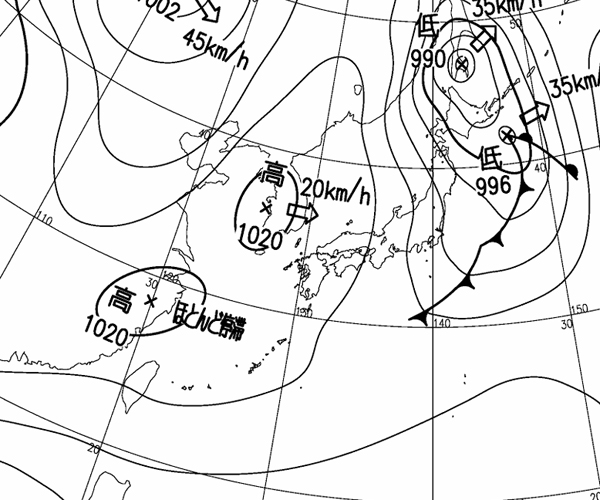 | 地上(高知大学気象情報頁赤外画像と気象庁速報天気図を合成) | |||
